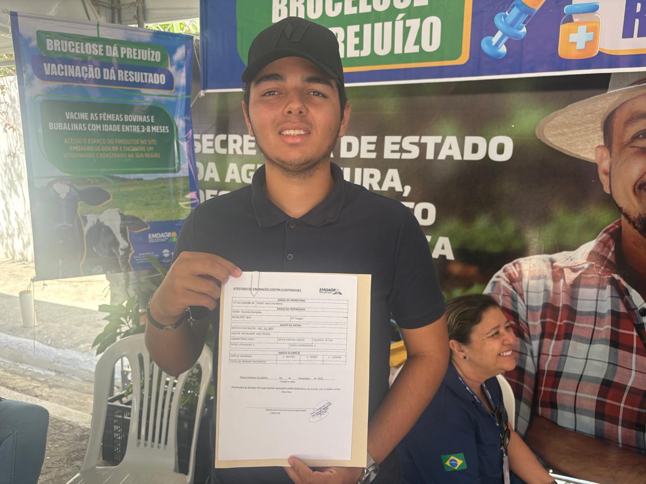 Luiz Eduardo Barros Santos foi um dos criadores beneficiados, que foi até o estande da Agricultura para receber o certificado de vacinação de seus animais. “Esse apoio da Emdagro é muito importante para nós, produtores rurais, não só por ofertar gratuitamente a vacinação e o profissional médico veterinário para aplicar, mas por garantir que nosso estado alcance o patamar de estado livre de doenças como a brucelose, clostridiose e a raiva, diferentemente de outros estados, que a gente sabe que não tem esse mesmo cuidado”, reforçou Luiz Eduardo que vacinou sete bezerras contra as três doenças.