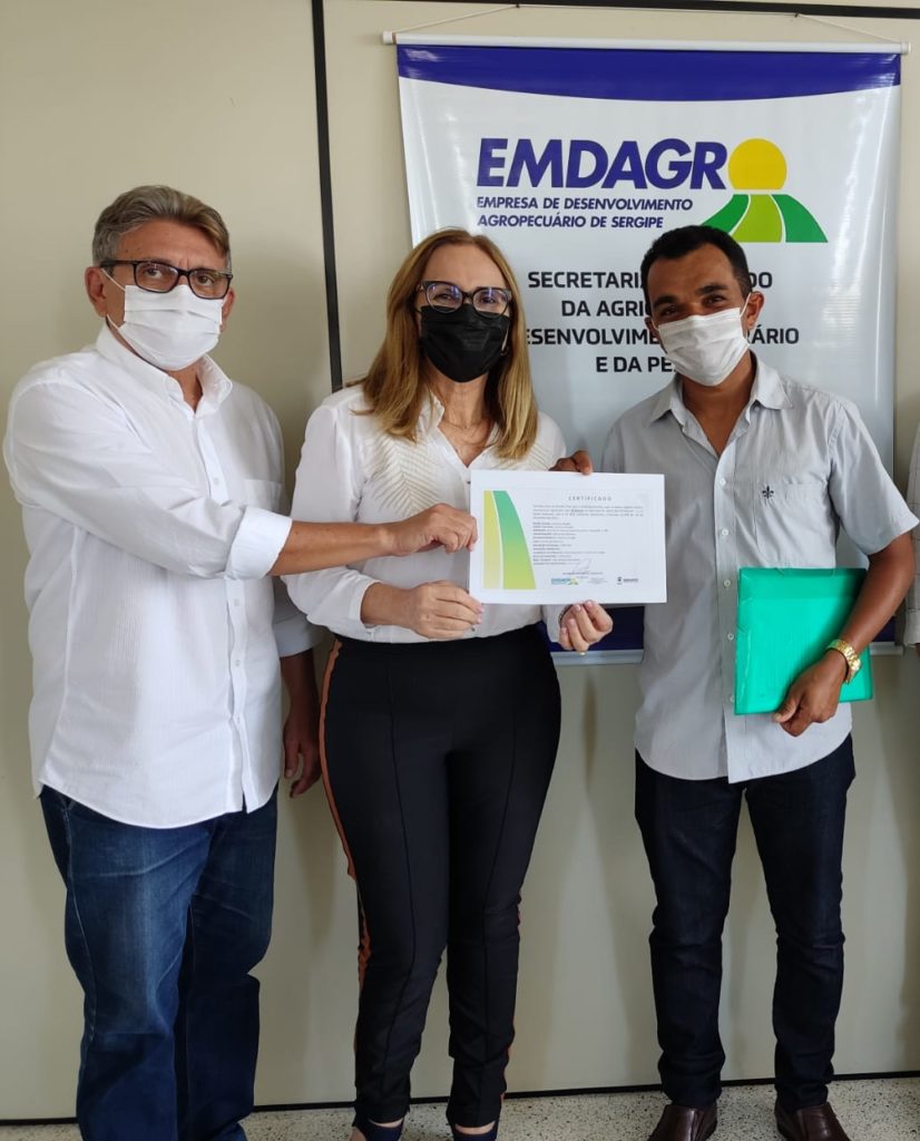 Com o objetivo de legalizar as queijarias de pequeno porte em Sergipe, o Governo do Estado, através da Secretaria de Estado da Agricultura, Desenvolvimento Agrário e da Pesca, e Empresa de Desenvolvimento Agropecuário de Sergipe (Emdagro) realizou, no último dia 12, a entrega do Certificado do Serviço de Inspeção Estadual (SIE) para o Laticínio Aragão, localizado no município de Aquidabã. Com a certificação, o laticínio já pode comercializar seus produtos em supermercados, delicatessen, mercearias e pizzarias, pois os consumidores passam a ter mais um atestado da qualidade dos produtos. A entrega foi realizada pelo Presidente da Emdagro, Jefferson Feitoza de Carvalho, juntamente com a Diretora de Defesa Animal e Vegetal, Aparecida Andrade, dos Coordenadores de Desenvolvimento Rural e de Inspeção Agropecuária, Ary Osvaldo Bomfim e Francisco Ronaldo Teles Cavalcanti, respectivamente.