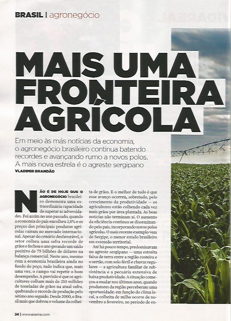 A Revista Exame, especializada em economia e negócios, em sua edição número 1110 de 30 de março de 2016 destaca o estado de Sergipe como novo polo agrícola brasileiro pelo aumento da eficiência produtiva de grãos, especialmente do milho.